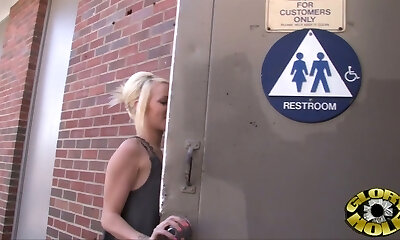 Lewd gamine light-haired head Lily Rader heads interracial in the gloryhole room