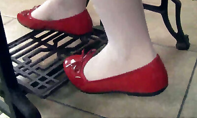 Pretty brunette gal Petra wears red flats while working with sewing machine