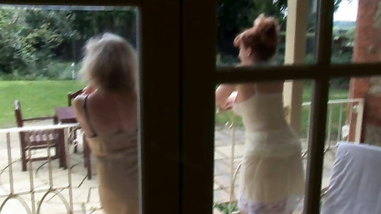 une cougar aux cheveux roux et brûlants tire sa culotte en découvrant sa chatte rasée puis lui caresse le bouton de joie