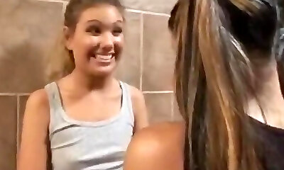 Naughty coed gals have fun in the toilet while teasing moist pussies